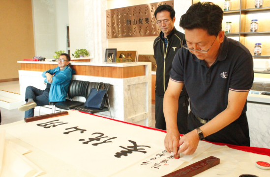 隨后,大家又來(lái)到燕麥博物館,感受燕麥文化、體驗(yàn)燕麥產(chǎn)品的同時(shí),并現(xiàn)場(chǎng)目睹書法名家張曉華老師的揮毫潑墨。孟才介紹,中國(guó)燕麥的市場(chǎng)份額在100億元以上,裸燕麥起源于中國(guó),但是國(guó)內(nèi)燕麥深加工所用的原糧90%是進(jìn)口皮燕麥,只有10%是國(guó)產(chǎn)裸燕麥,主要原因是國(guó)產(chǎn)裸燕麥多采用傳統(tǒng)旱作耕作方式,人工除草,有機(jī)種植,不使用除草劑、農(nóng)藥、化肥等,畝產(chǎn)較低。但是,也正因如此裸燕麥的口感更好、質(zhì)量更佳且蛋白質(zhì)、脂肪、β-葡聚糖等營(yíng)養(yǎng)成分均高于皮燕麥。得天獨(dú)厚的資源優(yōu)勢(shì)是陰山優(yōu)麥建企立身的根基和市場(chǎng)競(jìng)爭(zhēng)的底氣,產(chǎn)品全部采用優(yōu)質(zhì)的國(guó)產(chǎn)裸燕麥就是陰山優(yōu)麥的核心競(jìng)爭(zhēng)力!